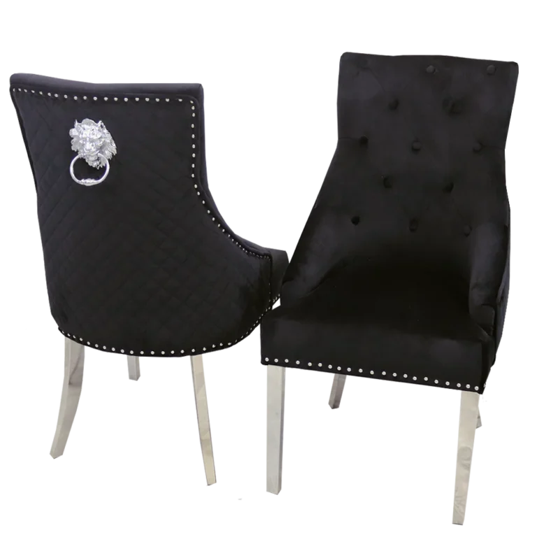 The Louis Gold Marble Dining Table Set, the epitome of modern luxury dining furniture and Parisian chic. The centerpiece is a striking gold base dining table featuring a premium, durable marble tabletop (or Sintered Stone) with natural, opulent veining. Complementing this flawless table are the bestselling Bentley Dining Chairs, upholstered in plush, high-quality velvet fabric. Each chair boasts a sophisticated quilted back design, elegant studded detailing, and the signature polished gold lion knocker, ensuring both comfort and dramatic style. This elegant marble and gold dining set is designed to be the focal point of any contemporary dining room or open-plan living space, perfect for stylish entertaining.