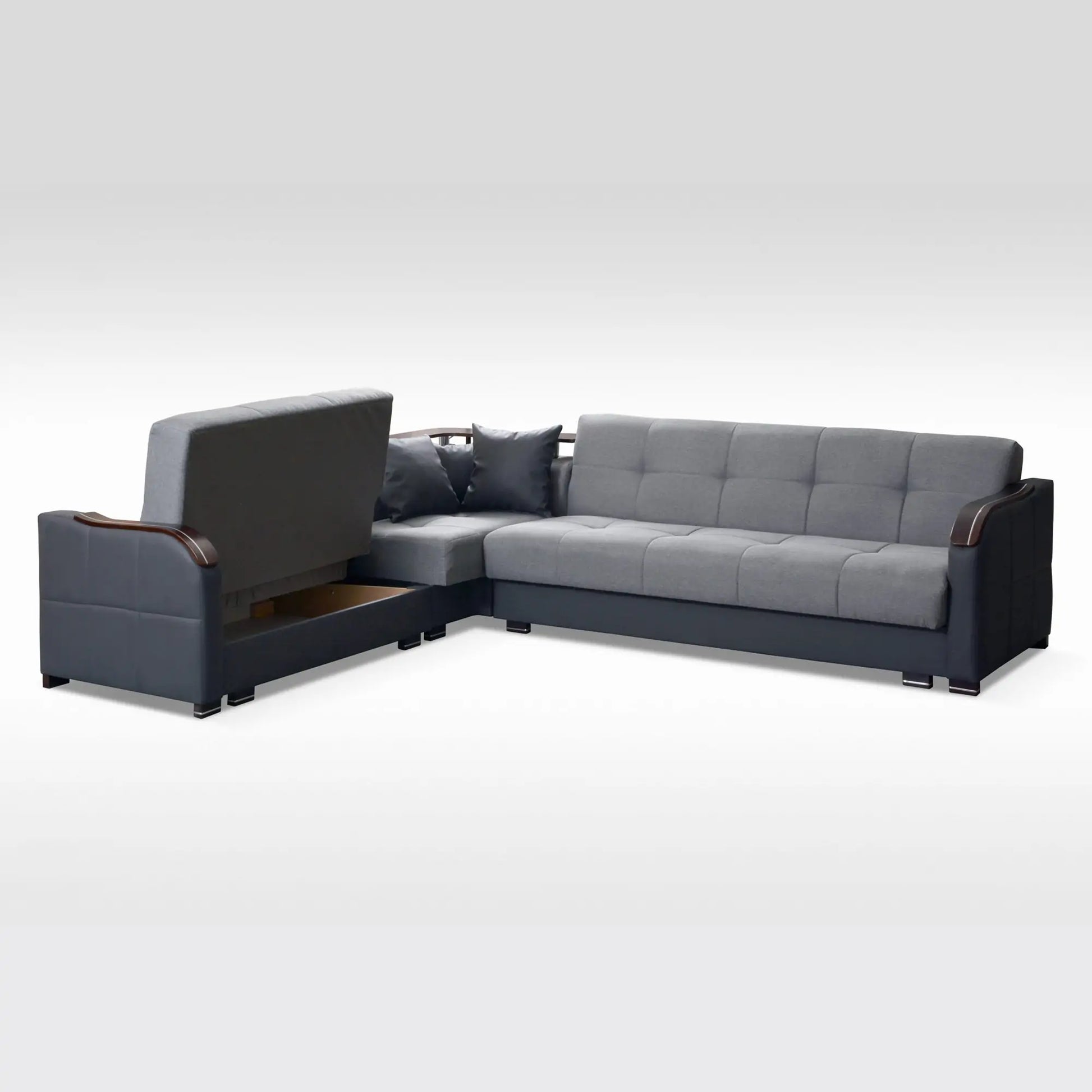 The FUTURO GREY CORNER SOFA BED is a spacious and highly functional centerpiece for any living room. This generously sized sofa (304 x 253 x 84 cm) features two storage compartments and two separate sleeping areas, making it a perfect solution for accommodating multiple guests. With dimensions of 196 x 120 cm and 120 x 120 cm, the beds offer ample space, while the Bonnell springs ensure lasting comfort