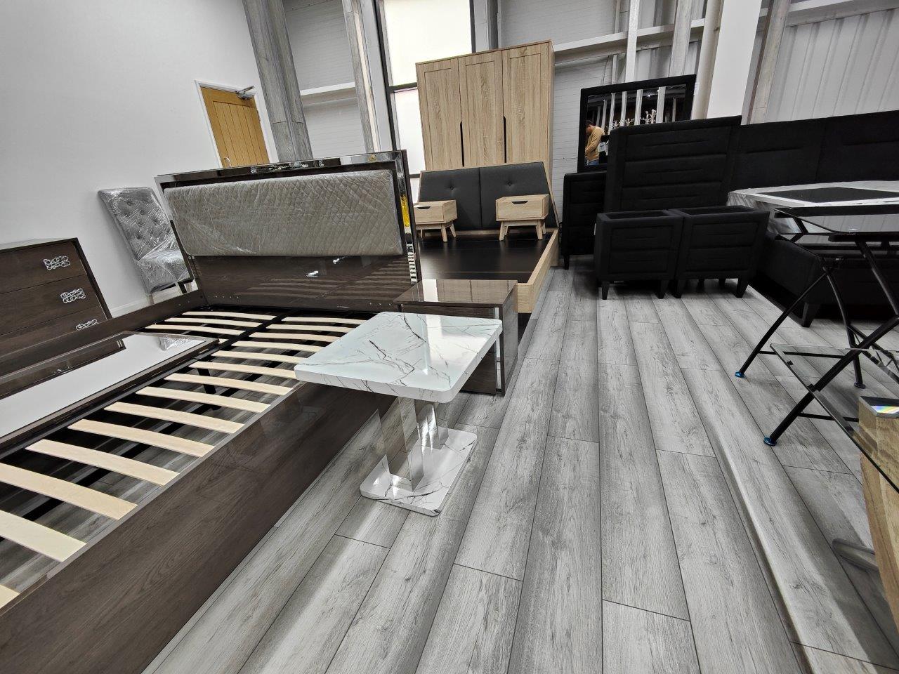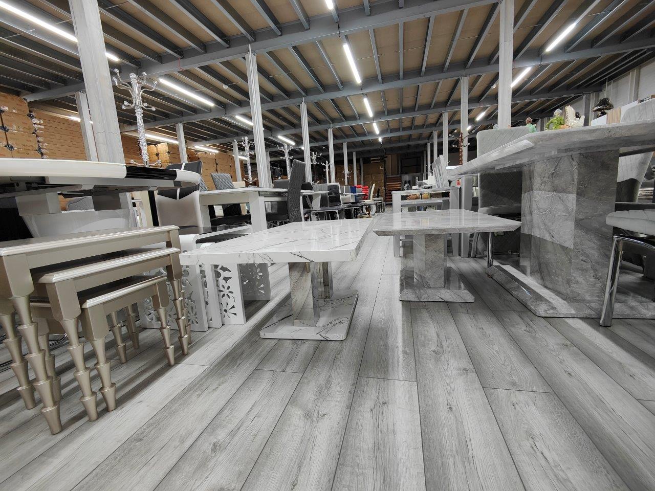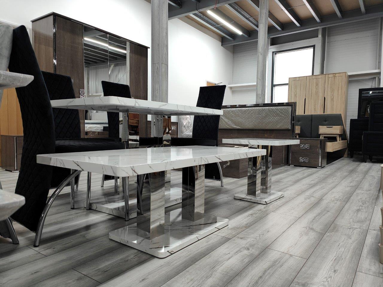 The Ice White Stone Effect Coffee Table and Side Table set is a stunning addition to any contemporary living room. This 2-piece set features a beautiful white stone-effect top that provides a clean, elegant look. Each table is supported by a sleek chrome frame, offering a modern aesthetic and durable construction.
