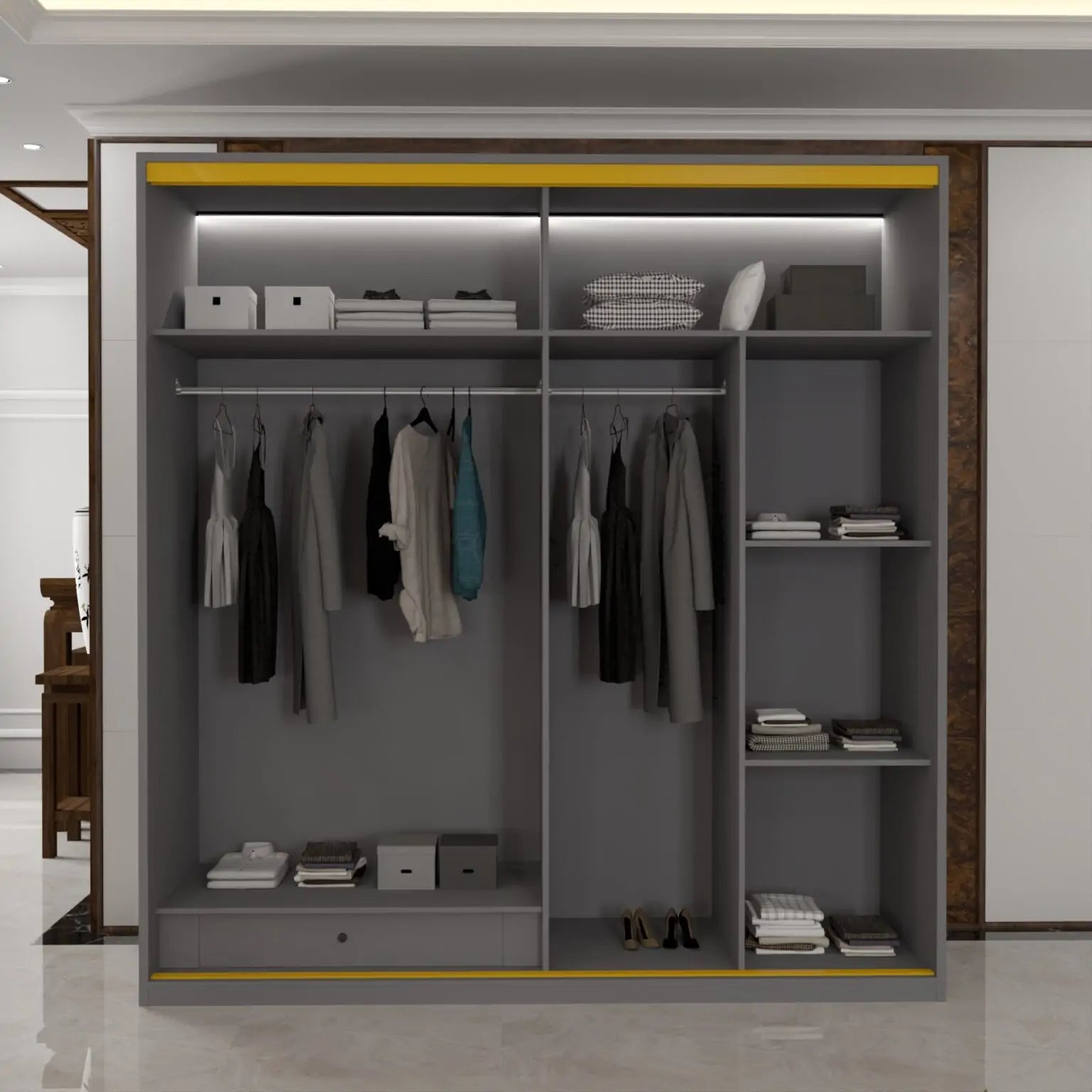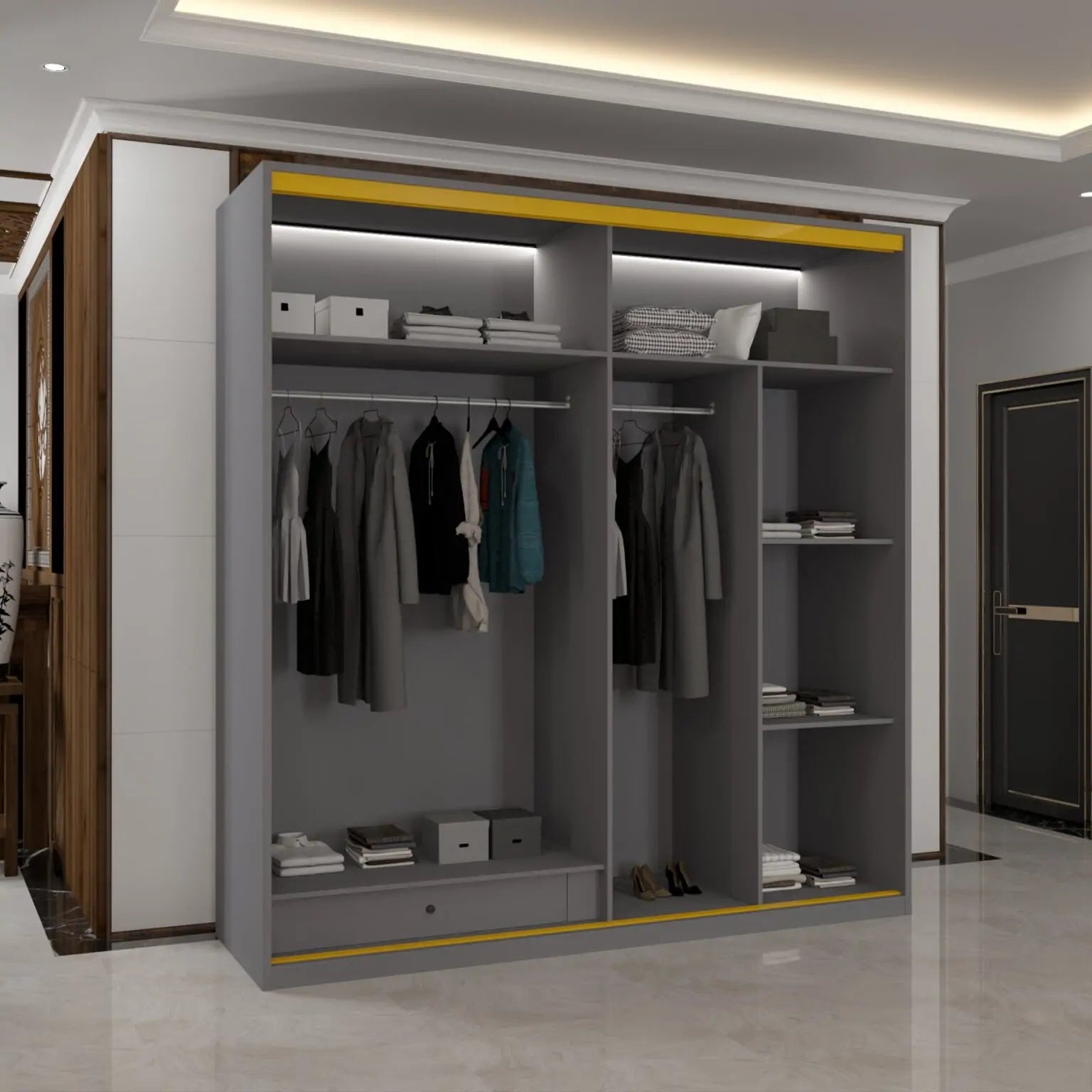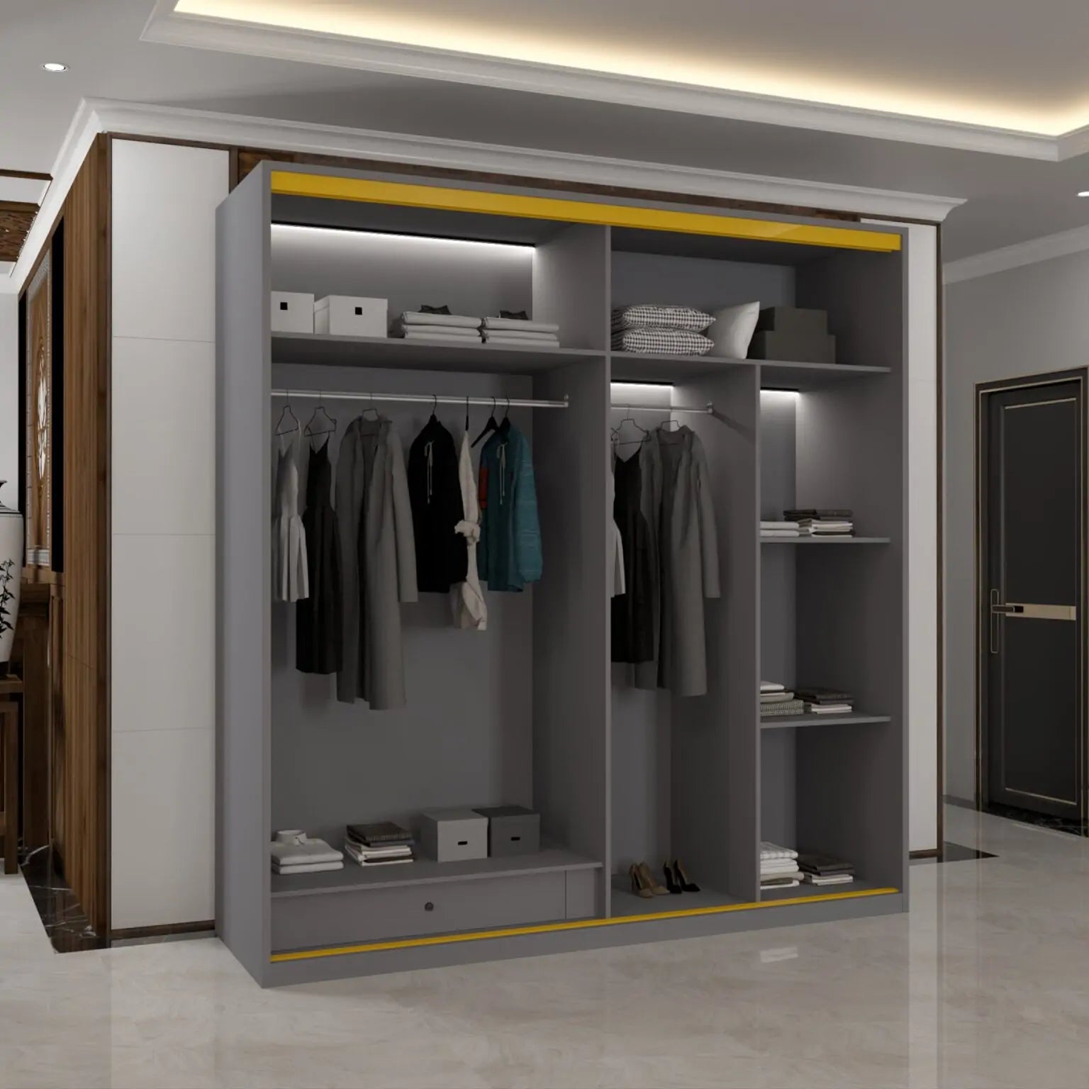 our New MDF Glass Sliding Door Wardrobe. Its elegant glass sliding doors save space and enhance light, creating an open, modern feel. Crafted from durable MDF with a thoughtful interior, it's the perfect blend of style and intelligent storage for any contemporary bedroom.