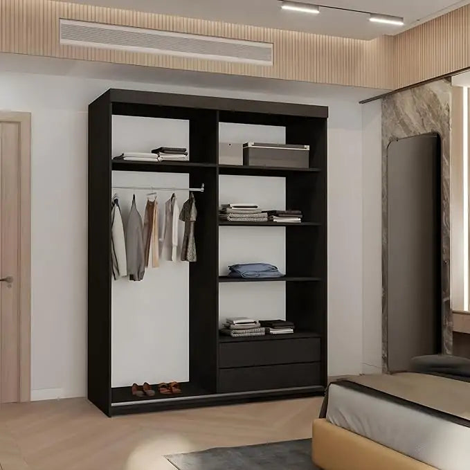 Smart Sliding Mirror Door Wardrobe. Featuring smart integrated features (e.g., LED lighting) and space-saving sliding mirror doors, it maximises light, space, and convenience. This is the intelligent, elegant solution for a perfectly organised and modern home.