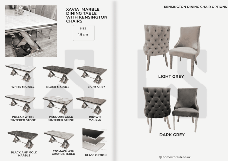 Create an instant contemporary focal point with the Xavia Dining Table and Kensington Chair Set. The striking Xavia Dining Table is defined by its ultra-modern polished stainless steel double X-leg base, providing exceptional stability and visual flair. Topped with a choice of high-quality marble, Sintered Stone, or glass, the tabletop offers impressive durability, scratch resistance, and an easy-to-clean surface perfect for busy modern life. This bold table is perfectly complemented by the elegant Kensington Dining Chairs. Upholstered in soft velvet fabric, these luxurious chairs feature a sophisticated quilted stitching back design, polished chrome studding, and a signature chrome lion or ring knocker detail. This combination of sleek chrome, opulent velvet, and bold geometric lines makes the Xavia and Kensington set the definitive choice for a luxury modern dining room that demands attention.